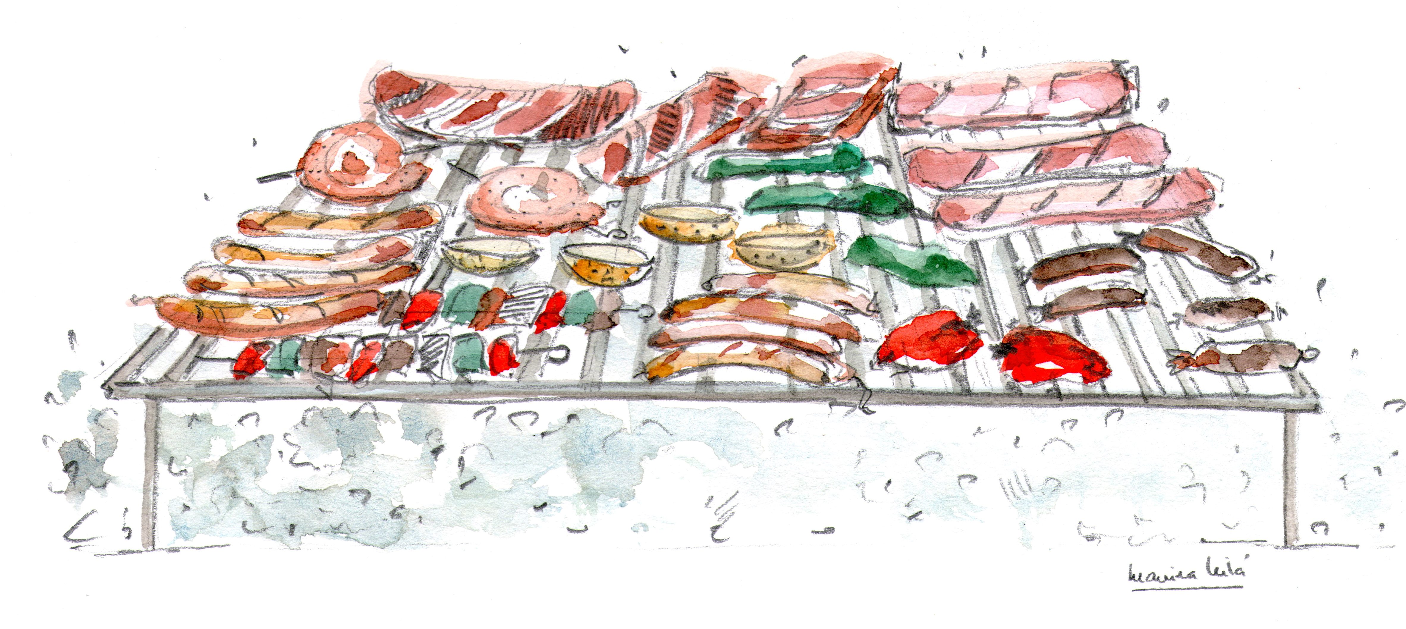 Ilustración en acuarela y lápiz del típico asado argentino.