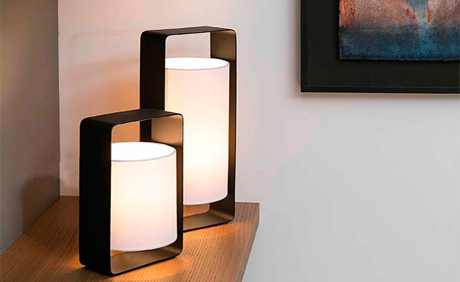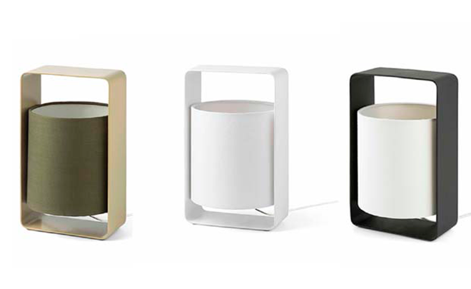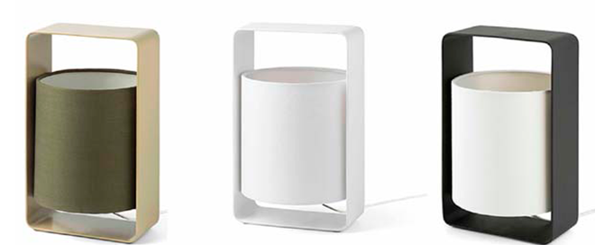 Su sencillo diseño, de formas suaves y austeras, la convierten en una agradable lámpara de compañía tanto en la sala de estar como en la mesilla de noche. La estructura está fabricada en acero y la pantalla textil parece estar suspendida dentro del anillo, que también sirve como asa de transporte. Fue presentada en la pasada edición de la feria Maison & Objet en París, puede ser una lámpara de sobremesa y también de suelo, que está disponible en dos tamaños: uno grande (16 x 15 x h 40 cm) y otro más pequeño (16 x 15 x h 27 cm). Ambas versiones ofrecen tres gamas de colores: blanca/negra, verde y blanca.